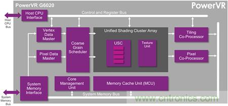 新款PowerVR G6020 GPU是專為能以超小硅晶面積實現繪圖功效而設計,能獲得更佳的真實裝置性能與兼容性,卻無需不必要的額外開銷。它是PowerVR Series6XE系列產品中尺寸最小的成員,具備四個算數邏輯單元(ALU)內核,硅晶面積僅2.2mm2 (28納米制程,400MHz)。為達到此目標,G6020具備一個特別為UI體驗設計的高度優化的統一渲染集群(USC)引擎。此特別配置的新款USC可在最小的面積與功率預算內實現最佳的特性組合,并能與其它的Rogue USC完全兼容。