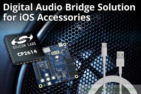 【導讀】近日,Silicon Labs(芯科科技有限公司)宣布,推出一款數字音頻橋接芯片CP2614和評估套件,旨在簡化iOS設備配件的開發以及助力于iOS設備配件的創新。CP2614為各類使用全數字閃電連接器的MFi設備(Made for iPod、iPhone或iPad)提供完整交鑰匙音頻橋接解決方案,同時也包括各類音頻配件。
