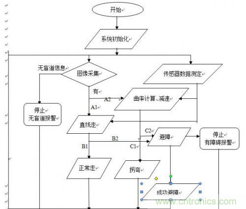 通過CMOS攝像頭采集路況信息,經(jīng)CPU處理判斷前方是否有障礙物。若無,則車繼續(xù)引導(dǎo)人前行;若有障礙物,則車發(fā)聲報警。通過超聲波傳感器檢測,如果可以越過則繼續(xù)前進,如果無法越過,就停止。如果需要轉(zhuǎn)彎,則減速轉(zhuǎn)彎。同時導(dǎo)盲車上還有GPS導(dǎo)航系統(tǒng),可以確切知道盲人所處位置。