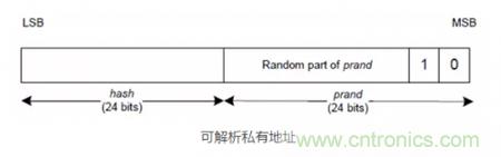 當設備B需要生成隨機地址的時候,其內部會首先生成一個隨機數prand,基于prand隨機數,設備B需要利用哈希hash算法生成可解析隨機地址的另外一部分,hash。prand隨機數和哈希hash分別占用24比特,計算公式為: