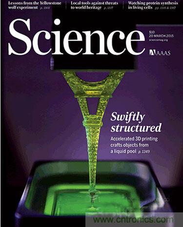 這些神奇的動圖都出自最近發(fā)表在《科學(xué)》(Science)上的一篇有關(guān)3D打印技術(shù)的研究論文。這種新技術(shù)顯然也征服了期刊的編輯,在期刊封面上都出現(xiàn)了這個從液體中打印出來的“倒立鐵塔”的身影。那么,這種液體3D打印技術(shù)究竟有什么過人之處?球和塔又是怎么從液體里“拉”出來的呢?