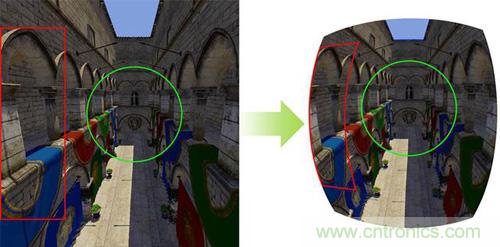 此外,作為VR領(lǐng)域不可或缺的技術(shù)之一,眼球追蹤技術(shù)還可以解決VR圖形畸變的問(wèn)題。圖形畸變,同樣也是造成使用者眩暈的因素之一。通過(guò)上圖,我們可以看到,左邊就是普通的游戲畫(huà)面,而右邊,就是VR設(shè)備里所呈現(xiàn)的畫(huà)面。由于圖像畸變的原因,VR設(shè)備所呈現(xiàn)的畫(huà)面中,圖像的邊緣已經(jīng)發(fā)生了明顯的畸變。即使Oculus曾在此問(wèn)題上投入了大量的研發(fā)成本并應(yīng)用反畸變算法優(yōu)化了VR設(shè)備的成像,離開(kāi)了眼球追蹤技術(shù),圖像邊緣的畸變依然無(wú)法完美地解決。
