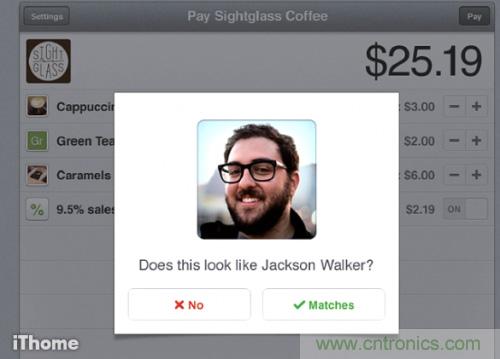 Square是另一個透過云端無實體卡片交易的提倡者,這個服務的目的是為了改造傳統的POS 終端機和庫存系統,一切都是從使用插在手機耳機孔的精美塑膠卡片刷卡裝置開始,Square 最近結束Square Wallet 這項支付產品,它是Register 應用程式的搭配產品,使用者可以連結信用卡或金融簽帳卡,然后只要在喜歡的商家打卡,結帳時提供姓名,他的面孔和名字就會出現在商家的Register應用程式上(下圖),是PayPal 的地理定位支付功能的先驅,Square轉換方向,發表了一項全新產品,叫做Square Order,能讓使用者透過優雅的訂購流程和單擊結帳跟附近的餐廳點餐,他們只要走到或開車到商家取餐。
