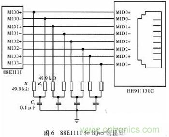 88E1111和網絡介質之間無法直接連接,因傳輸速度在千兆級,所以更加需要設計合適的網絡隔離變壓器來降低傳輸損耗、回音和串擾。本文選擇千兆網口插座HR911130C,該插座內部自帶變壓器電路,只需在外部連接濾波網絡便可實現網絡信號穩定地傳輸,如圖6所示。88E1111和 HR9111130C采用差分連接,在PCB布線時需要嚴格等長,且一般還需使用阻抗匹配網絡,如圖6中的R1和C1。