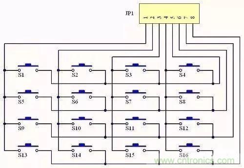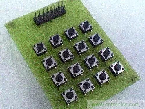 圖a是矩陣鍵盤電路,圖b是筆者焊接的矩陣鍵盤。這是一個利用了元器件自身結(jié)構(gòu)的典型例子:圖b中的輕觸式按鍵有4只腳,其中兩兩相通,我們便可以利用這一特點來簡化連線,電氣相通的兩只腳充當了跳線。讀者可以對照圖c好好體會一下。
