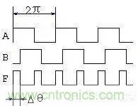 從表1可知,如果輸入端A和B分別送入占空比為50%的信號波形, 則當兩者存在相位差Dθ時,輸出端F的波形的占空比與Δθ有關,見圖3。將F輸出波形通過積分器平滑,則積分器輸出波形的平均值,它同樣與Δθ有關,這樣,我們就可以利用異或門來進行相位到電壓的轉換,構成相位檢出電路。于是經積分器積分后的平均值(直流分量)為:U = Vdd * Δ θ/π (1)