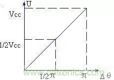 不同的Δθ,有不同的直流分量Vd。Δθ與V的關系可用圖4來描述。從圖中可知,兩者呈簡單線形關系:Ud = Kd *Δθ (2)Kd 為鑒相靈敏度
