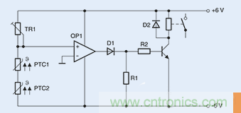 切換原理:記錄溫度限值圖3顯示為由兩個串聯(lián)正溫度系數(shù) (PTC) 傳感器組成的一個簡單電路,。TR1與兩個正溫度系數(shù) (PTC) 傳感器組成一個分壓器,該分壓器能夠提供運(yùn)算放大器的非反相輸入,而運(yùn)算放大器則充當(dāng)比較器的角色。