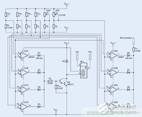 用于監(jiān)測兩個熱區(qū)的電路:例如,當(dāng)超過溫度限值后,一臺風(fēng)扇將自動開啟。