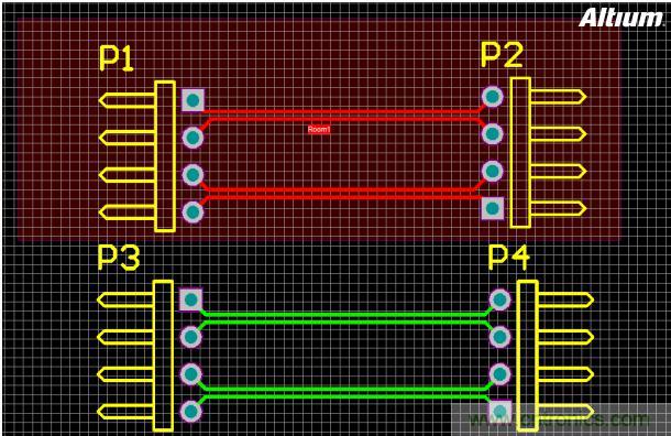 很明顯,2組同樣連線同樣間距的差分對,在Room里的對象沒有報錯,使用新建Room設置的規則。而Room外的對象依然是報錯狀態。這就是Room為不同區域設置規則的效果。