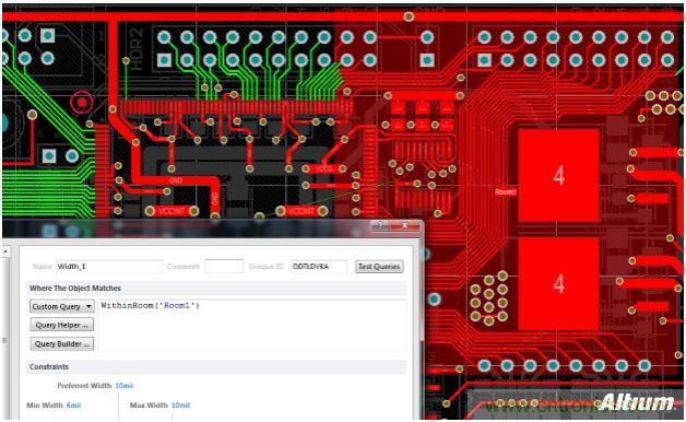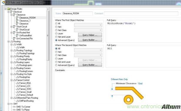 在Room里框選出一定區域后,不僅僅是可以單獨設置線寬規則,還可以對它設置PCB Rule規則定義頁面上的任意規則。