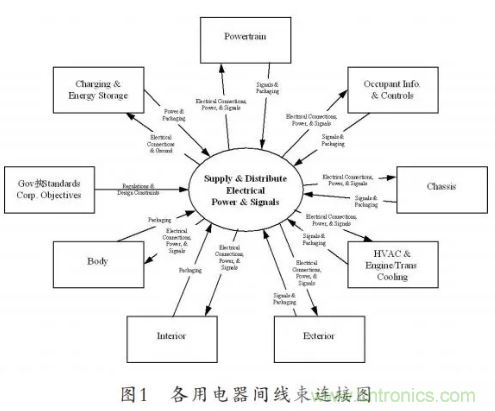 線束是汽車的神經(jīng)網(wǎng)絡(luò)系統(tǒng),在整車的運行中傳遞電壓、信號及大量的數(shù)據(jù),圖1為各用電器線束連接示意圖。特別是在互聯(lián)網(wǎng)、大數(shù)據(jù)背景下,這就要求線束載體不僅僅起到通斷作用,對數(shù)據(jù)的傳輸速率及響應(yīng)能力提出了更高的要求,同時由于線束的物理布置空間有限,對其失效性和售后返修帶來更大挑戰(zhàn)。