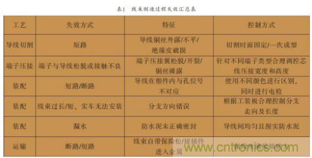 如下表1是線束在制造過程中最常見的失效方式,需在制造的各個環(huán)節(jié)保證線束的制造質(zhì) 量。機械設(shè)備設(shè)定合理的規(guī)格參數(shù),人工操作建立標(biāo)準(zhǔn)化操作及比對面板,最后對線束進行抽查全方位檢測而保證線束的制造質(zhì)量。
