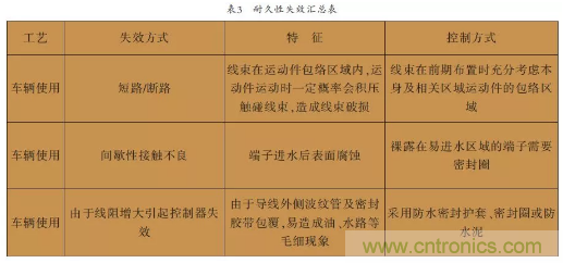 耐久性失效是一種隨著車輛使用,在中間環(huán)節(jié)形成的失效方式,是伴隨著車輛的生命周期隨機產(chǎn)生的,具有不可預(yù)測性。一旦失效會引起客戶對品牌的極大抱怨。此類失效多為線束在運動件包絡(luò)區(qū)域內(nèi)發(fā)生,在達到一定的磨損后產(chǎn)生的,因此在初期不易察覺。如下表3為耐久性失效匯總表。