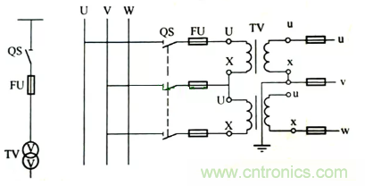 單相電壓互感器一次側(cè)端子為U、X,二次側(cè)為u、x;三相電壓互感器一次側(cè)端子為U、V、W,二次側(cè)為u、ⅴ、w、0。電壓互感器具有首端標(biāo)志u的端子應(yīng)和儀表的相線端連接,末端x接地并與儀表中性線端連接。