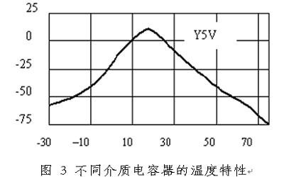 由于電容器中的介質參數受到溫度變化的影響,因此電容器的電容值也隨著溫度變化。不同的介質隨著溫度變化的規律不同,有些電容器的容量當溫度升高時會減小70%以上,常用的濾波電容為瓷介質電容,瓷介質電容器有超穩定型:COG或NPO,穩定型:X7R,和通用型:Y5V或Z5U三種。不同介質的電容器的溫度特性如圖2所示。