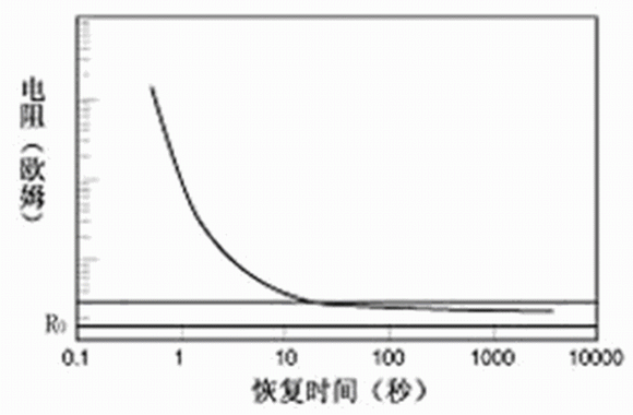 高分子PTC熱敏電阻由于電阻可恢復(fù),因而可以重復(fù)多次使用。圖6為熱敏電阻動(dòng)作后,恢復(fù)過(guò)程中電阻隨時(shí)間變化的示意圖。電阻一般在十幾秒到幾十秒中即可恢復(fù)到初始值1.6倍左右的水平,此時(shí)熱敏電阻的維持電流已經(jīng)恢復(fù)到額定值,可以再次使用了。一般說(shuō)來(lái),面積和厚度較小的熱敏電阻恢復(fù)相對(duì)較快;而面積和厚度較大的熱敏電阻恢復(fù)相對(duì)較慢。