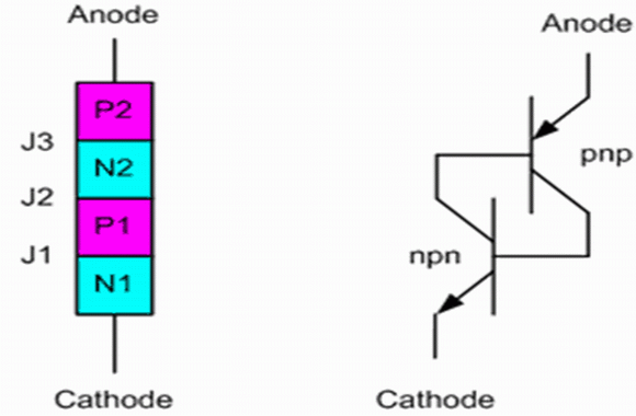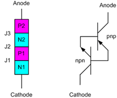 而當在陽極到陰極之間加一個負電壓偏置時,情況就完全不同了。因為此時只有J2處PN結是正向偏置,而這個正向偏壓PN結可以認為是這對雙極性晶體管的發射極和基極,這種非常規的情況如圖3所示 。同一個PN充當兩個三極管的發射極是不可能的。至于陽極到陰極成反偏壓的晶閘管情況很類似一個反向偏壓的二極管如圖4所示。