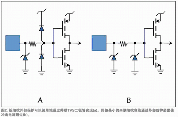 設(shè)計(jì)時(shí),可以保護(hù)簡(jiǎn)單低速的單端輸入/輸出(I/O)線(xiàn),開(kāi)發(fā)利用類(lèi)似于IC制造商使用的拓?fù)浣Y(jié)構(gòu)。實(shí)際上,如果選擇了更有效的抑制器,并且將其放置在離瞬態(tài)切入點(diǎn)盡可能近的位置,產(chǎn)品的瞬態(tài)承受能力將會(huì)大大地提高。如果輸入/輸出線(xiàn)需要低阻抗回路,可以簡(jiǎn)單地使單一的TVS二極管鄰近信號(hào)的外部連接器(圖2a)。這個(gè)處理方法會(huì)使外部和芯片上的二極管共享電流。