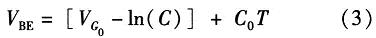 如果忽略由溫度變化引起lnT項變化對式(2)的影響,dVBE/dT可近似等于常數C0。常溫下C0約為-2 mV/K。為了簡化計算,則PN結關于溫度的變化方程可近似線性為