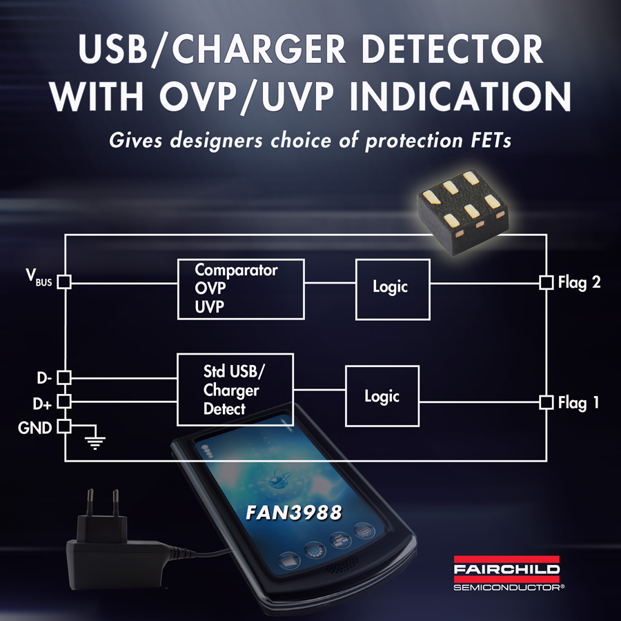 飛兆半導體公司(Farichild Semiconductor) 為手機和手持移動產(chǎn)品設(shè)計人員提供一款帶有高集成度過電壓保護(OVP)和USB/充電器檢測功能的器件FAN3988。該器件是飛兆半導體OVP產(chǎn)品系列的最新成員,可讓終端用戶按照應用所需之特定導通電阻和電流能力,靈活選擇外部P溝道MOSFET。