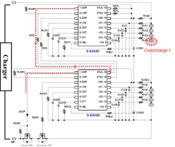 下面,詳細介紹一下保護芯片級聯的具體工作情況。還是以S-8204B為例,其CTLC端子可由芯片外部控制COP端子的輸出電壓、而CTLD端子則可由芯片外部控制DOP端子的輸出電壓。通過CTLC端子以及CTLD端子可以分別單獨控制COP端子與DOP端子的輸出電壓。并且,這些控制功能優先于芯片內部的電池充放電保護功能。如果8節電池中的某一節電池發生過充,與該電池相連接的S-8204B的COP端子輸出電壓會發生變化,該電壓變化會傳遞到與其相連接的另一個S-8204B的CTLC端子,使得另一個S-8204B的COP端子輸出電壓也發生變化,從而控制充電控制用MOSFET關斷,實現鋰離子電池的過充電保護。
