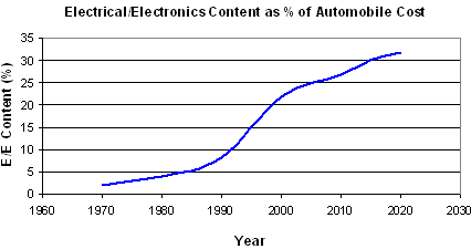 汽車電子和電器設(shè)備以平均每輛車每年超過110W的速度遞增,最近,過去由機械力和液壓力推動的系統(tǒng)都改由電力驅(qū)動,對電能的大部分需求都源于此。上世紀(jì)80年代出現(xiàn)的防抱死剎車系統(tǒng)(ABS)具有存儲容量大約為8KB電子控制單元;而現(xiàn)代的第五代ABS硬件配備128KB的存儲器,大小僅僅為早期系統(tǒng)的40%。由于設(shè)計精巧和創(chuàng)新,現(xiàn)代電氣/電子系統(tǒng)對功率的要求通常比最初推出的系統(tǒng)要小。
