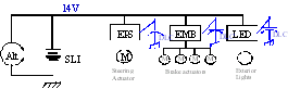 在這個高度簡化的描述中,超級電容分布模塊或雙層電容(DLC)緊靠高耗能用電負(fù)載,如EPS(1.2KW)、電子機械剎車(1到2KW)和新型照明系統(tǒng)(如最近出現(xiàn)的白光LED頭燈)。本地分布式模塊為高峰負(fù)載供電,避免造成來自交流發(fā)電機和電池的14V電源線出現(xiàn)強烈的波動。