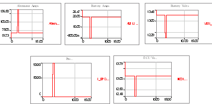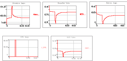 當(dāng)EPS工作時,下圖描繪了上述電路引起的PowerNet瞬態(tài)波動。注意:當(dāng)電力分配網(wǎng)絡(luò)穩(wěn)定時,交流發(fā)電機提供給電池的最初充電電流。[page]
