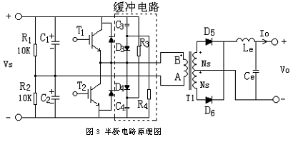 本文選用半橋電路的拓撲結構形式,采用電壓型反饋控制模式。 半橋電路的原理圖如圖3。