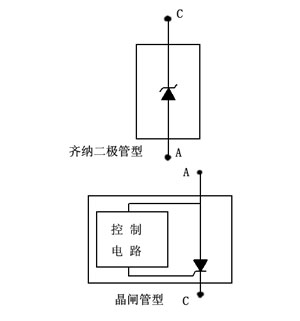 NUD4700是一種兩端器件,其外形如圖3所示,A端為陽極,C端為陰極。其內部結構如圖2的下圖所示,它由控制電路及單向晶閘管組成。