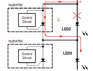 NUD4700的典型應用電路如圖4所示。這是一個交流供電,往AC/DC轉換器輸出直流電壓,再由NUD4701恒流LED驅動器驅動5個串聯的1W大功率LED的電路。NUD4700與LED并聯連接在一起。在LED未開路時,由于LED的正向降壓VF小于晶閘管的“開啟”電壓V(BR),則NUD4700為“關閉狀態”。在關閉狀態時,只有小于250μA的漏電電流經過NUD4700,相當于NUD4700“開路”,不影響LED的工作。若串聯的LED中有一個(如LED2)因損壞而開路了,此時與LED2并聯的NUD4700的A、C之間電壓超過了“啟動”電壓V(BR)(5.5~7.5V),NUD4700啟動,由關閉狀態轉為“導通狀態”。在導通狀態時,A、C之間導通電壓VT為1.0~1.2V。此時,LED的電流由LED1流經NUD4700的A、C,再流入LED3,如圖5所示。5個LED的燈僅有4個LED工作,其亮度稍差一些,但仍可以正常工作,并且不影響其恒流的大小。