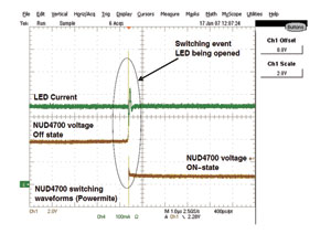 NUD4700的典型工作波形如圖6所示。圖6中,綠色是LED電流波形,棕色是NUD4700關閉狀態轉換到導通狀態的波形。橢圓內是LED開路瞬間波形,此時,LED電流IF經一些波動后恢復到原來電流;與此同時,NUD4700由關閉狀態轉換到導通狀態,其電壓由VF下降到1~1.2V,其響應時間是很快的(dv/dt最小值為250V/μs)。