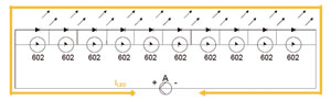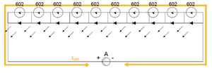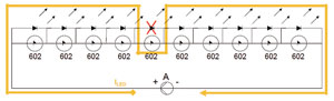 若在串聯的LED中有一個開路,如圖9所示,則與此并聯的SMD602的正、負極之間電壓大于其開啟電壓4.65~5.25V,此器件由關閉狀態轉換為導通狀態,降壓為1~1.2V。LED電流經SMD602內部的晶閘管后流到下一個LED,保證其他未開路的LED正常工作。圖中用紅線X表示此LED開路。