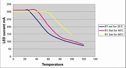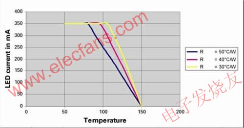 圖1中曲線顯示了1WLED的典型性能下降特性。正如所期望的那樣,這清楚地表明,被恒定電流驅動的LED在到達某一點后,該恒流需要線性地減少,直到在150℃這一點上達到0。恒流下降點和減小斜率取決于機械/散熱安排。