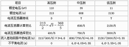 實例:一臺三相三繞組降壓變壓器,容量Se=40.5MVA,電壓110±2×2.5%kV/385±2×2.5%kV/11kV,接線方式:Ydd11-11,變壓器額定電流:213A/608A/2130A。主變差動保護采用BCH-2型差動繼電器?;居嬎闳绫?所示,已確定110kV側為基本側。