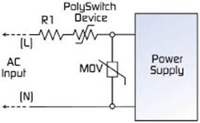 如圖1所示,PolySwitch™PPTC器件可以串聯在電源輸入端,幫助保護因電路短路、線路過載或者用戶誤操作造成的損壞。另外,在輸入兩端放置金屬氧化物變阻器(MOV)還可提供過壓保護。