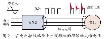 微浪涌電壓是變頻器和電機之間的接線長度很長時,在電機接線端產(chǎn)生的極細的尖峰浪涌電壓。如圖2所示,逆變器的輸出電壓是脈沖狀,在電機接線端子上發(fā)現(xiàn)在脈沖狀的波形上又疊加了微浪涌電壓尖峰。一般情況下,微浪涌電壓的尖峰值將會是逆變器內(nèi)部的直流電壓的2 倍。