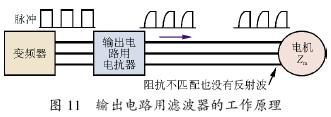 輸出濾波器的工作原理如圖11所示。微浪涌電壓是變頻器輸出脈沖上升時間出現(xiàn)的dv/dt 過大所引起,又由于阻抗不匹配被反射而發(fā)生。因此輸出電路使用濾波器,用于抑制dv/dt,也就是抑制了高頻成分因阻抗不匹配而造成的微浪涌。所以輸出濾波器是dv/dt抑制型濾器,這種濾波器在變頻器的調(diào)制頻率為15 kHz、接線長度為400 m時,能做出微浪涌電壓1 000 V以下的性能非常優(yōu)良的產(chǎn)品。不過,這種方式的濾波器為了讓逆變器的輸出電流通過電抗器,不得不做成大容量,造成濾波器的大型化、高價格化、大重量,有的達到50 kg以上,給用戶造成了實際負擔(dān)。