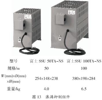 圖13 所示為浪涌抑制組件的外觀。和輸出濾波器相比,浪涌抑制組件是小型化的產(chǎn)品。其技術(shù)指標為相間的微浪涌電壓1 000 V以下,防護等級為IP20。浪涌抑制組件是對變頻器的容量不需要選擇,而接線距離需要選擇的產(chǎn)品。另外,接線方法非常簡單,只需要把浪涌抑制組件的輸入電纜接到電機接線端子U、V、W上。