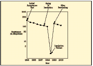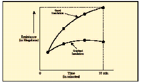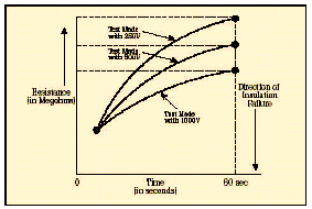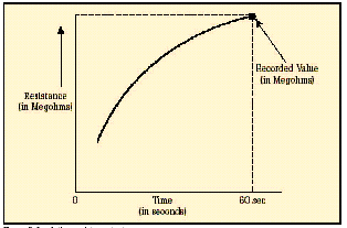 在短時測試中,兆歐表被直接跨接在被測設備上,施加大約60秒的測試電壓。為了在大約一分鐘的時間內使絕緣值讀數達到穩定,應該只對低容性的設備進行該項測試。基本的連接步驟和驗證測試時相同,所施加的電壓按DC測試電壓公式進行計算。當測試好的設備時,您會注意到,隨電容容量和吸收電流的降低,絕緣阻抗值會穩定上升。由于溫度和濕度會影響測試結果,應該在標準溫度(大約20?C/68?F)下、露點之上的環境下進行測試。    當設備的額定值等于或小于1000伏特時,絕緣讀數應該為1MΩ或更高。當設備額定值高于1000伏特時,理想的阻抗應該為每1000伏特上升1MΩ。所測量的絕緣阻抗值通常會略低于以前記錄的值,其下降的趨勢規律如圖6所示。絕緣值下降的斜率是絕緣材料老化程度的正常信號。陡峭的下降斜率是絕緣失效或可能出現故障的先兆。