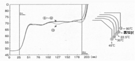 依此就可推論「線路圖案直線部分」與「造成輻射最大值的波長」兩者的關連性,也就是說線路圖案直線部分長度較短的A、B、C三線路圖案的輻射較低,相形之下D、E、F的輻射比較大;凹凸集中的D、E、F的輻射比凹凸分散的A、B、C大,G則無法納入檢討范圍。