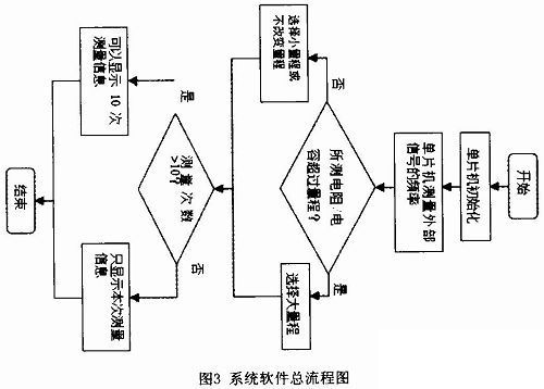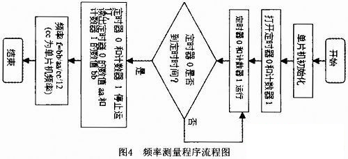 主要的子程序包括頻率測量子程序、鍵盤掃描子程序和數(shù)據(jù)存取子程序。頻率測量程序是系統(tǒng)軟件的核心,原理是用一個(gè)標(biāo)準(zhǔn)的頻率時(shí)鐘去計(jì)算被測的頻率,頻率測量程序流程圖如圖4所示。