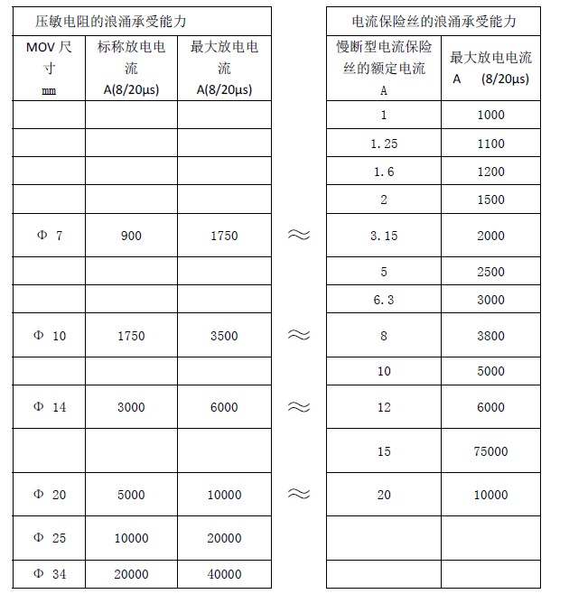 3.1 壓敏電阻MOV 與電流保險絲FUSE 的浪涌電流承受能力對比,見表1