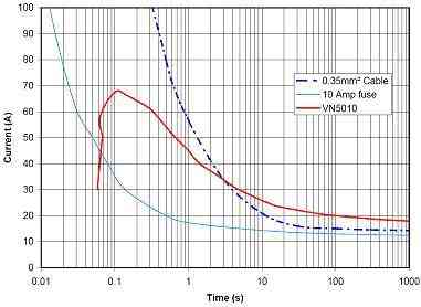 在圖3的示例中有一個點,智能開關 (VN5010)將繼續前行,而電線將開始自毀(紅線在藍色虛線上方)。如果這種情況是真實的,甚至連電路板都可能會自毀?,F在考慮到涌流要求很可能更加嚴格,我們開始意識到有必要開發一個能夠仿真熔斷器特性的保護算法。