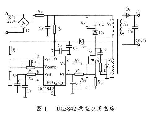 UC3842的典型應用電路如圖l所示。該電路主要由橋式整流電路,高頻變壓器,MOS功率管以及電流型脈寬調制芯片UC3842構成。其工作原理為:220V的交流電經過橋式整流濾波電路后,得到大約+300V的直流高壓,這一直流電壓被M0S功率管斬波并通過高頻變壓器降壓,變成頻率為幾十kHz的矩形波電壓,再經過輸出整流濾波,就得到了穩定的直流輸出電壓。其中高頻變壓器的自饋線圈N2中感應的電壓,經D2整流后所得到的直流電壓被反饋到UC3842內部的誤差放大器并和基準電壓比較得到誤差電壓Vr,同時在取樣電阻R11上建立的直流電壓也被反饋到UC3842電流測定比較器的同柑輸入端,這個檢測電壓和誤差電壓