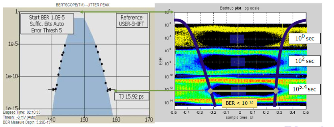 圖2 左面BERT 抖動峰值與右面示波器抖動浴缸之間的BER性能等效圖