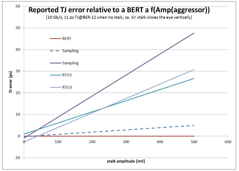 圖4 與BERT相比,示波器中的TJ誤差。(注: RTO = 實時示波器,采樣 = 等效時間示波器)
