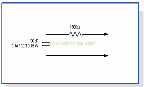 建立。針對(duì)不同情形可以用幾種公認(rèn)的模型描述帶電人體,最為通行的模型(圖2)是充電到15,OOOV的100pF電容與1500。電阻串聯(lián)。