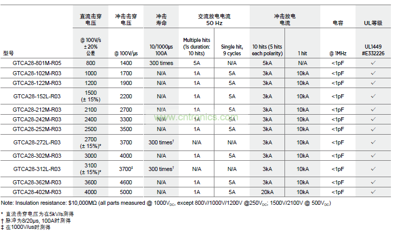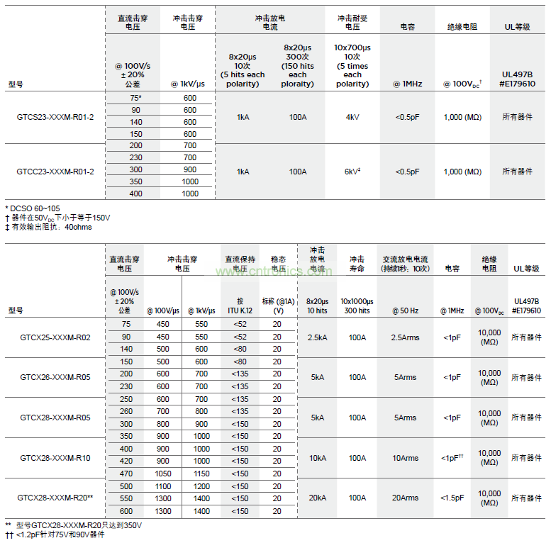 表 G1 兩電極GDT器件額定電壓值、額定浪涌值、電容值、絕緣電阻值和安規認證
